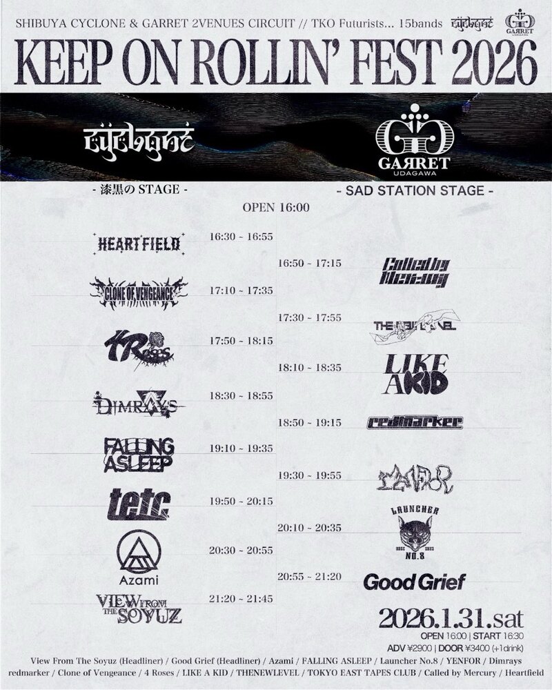 SHIBUYA CYCLONE pre. KEEP ON ROLLIN' FEST 2026 CYCLONE & GARRET 2VENUES CIRCUIT タイムテーブル解禁