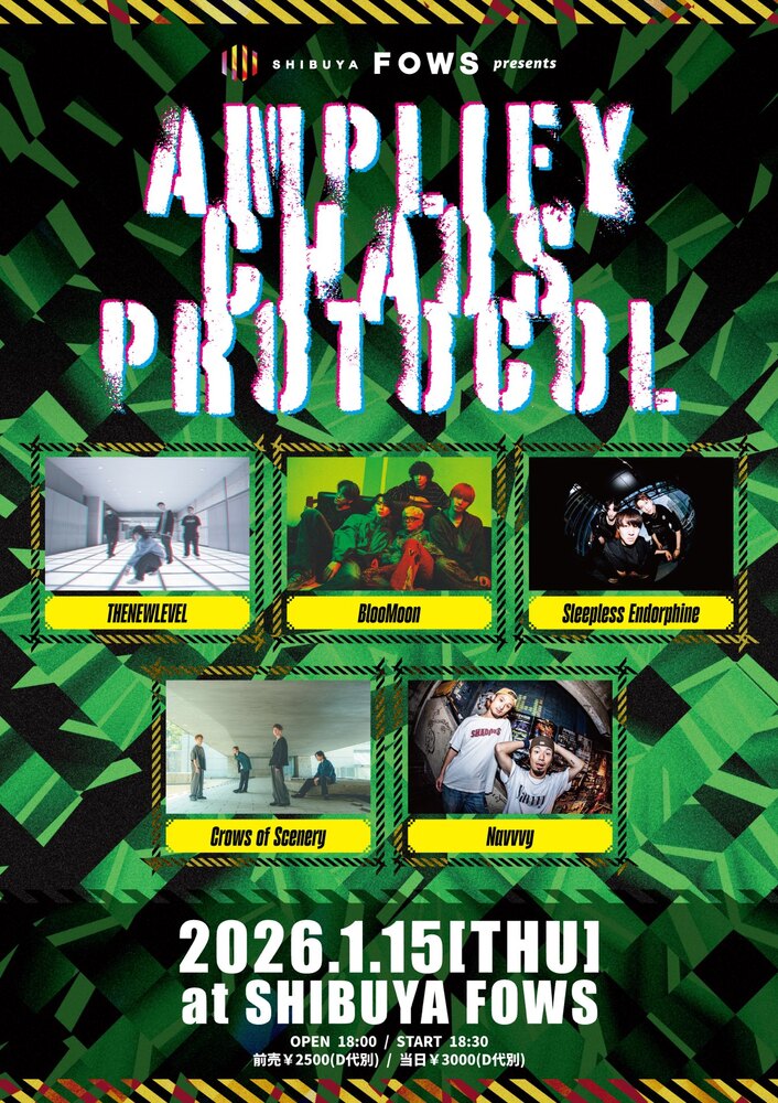 FOWS Pre. 『AMPLIFY CHAOS PROTOCOL』 LIVE 2026/01/15(木) 渋谷 FOWS 地図を表示 -ACT- THENEWLEVEL BlooMoon Crows of Scenery Navvvy Sleeples Endorphine THENEWLEVELは21:10からの出演となります OPEN 18:00 / START 18:30 ADV ¥2,500 / DOOR ¥3,000 (+1D) 取り置き予約リンク URLをコピーする 報告する